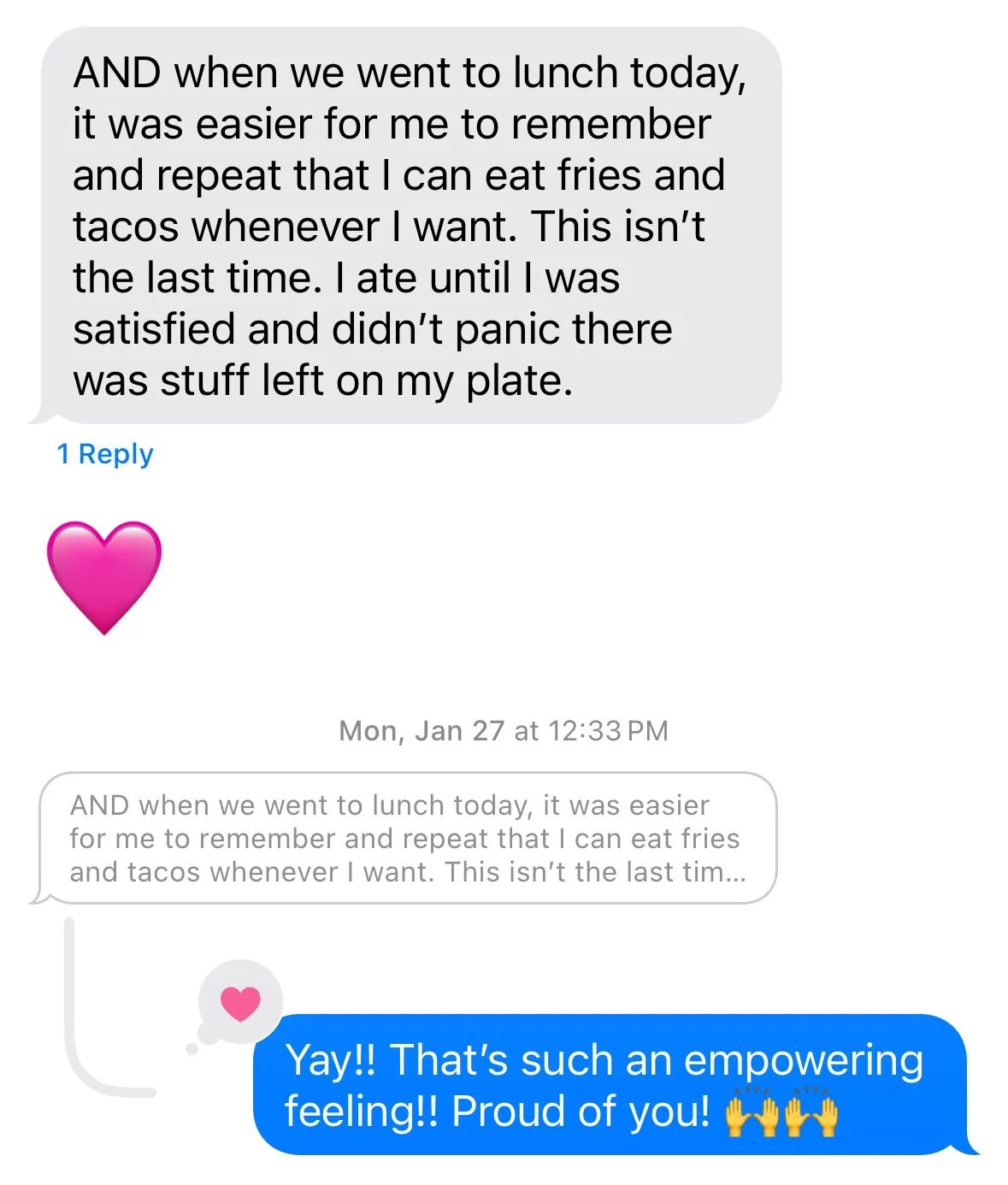 Healing doesn’t happen in isolation. You don’t have to figure it out on your own. Let’s work together and make guilt, regret, and shame with food a thing of the past.